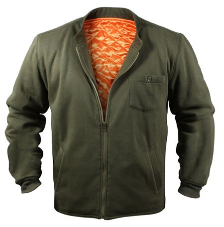Military Flyer's Jacket Intermediate Fleece Olive Drab cotton/poly outershell. Orange quilted polyester lining. slash pockets. Left chest pocket with button. Ykk zipper. Mandarin collar. Two cotton ribbed cuffs. Olive drab.